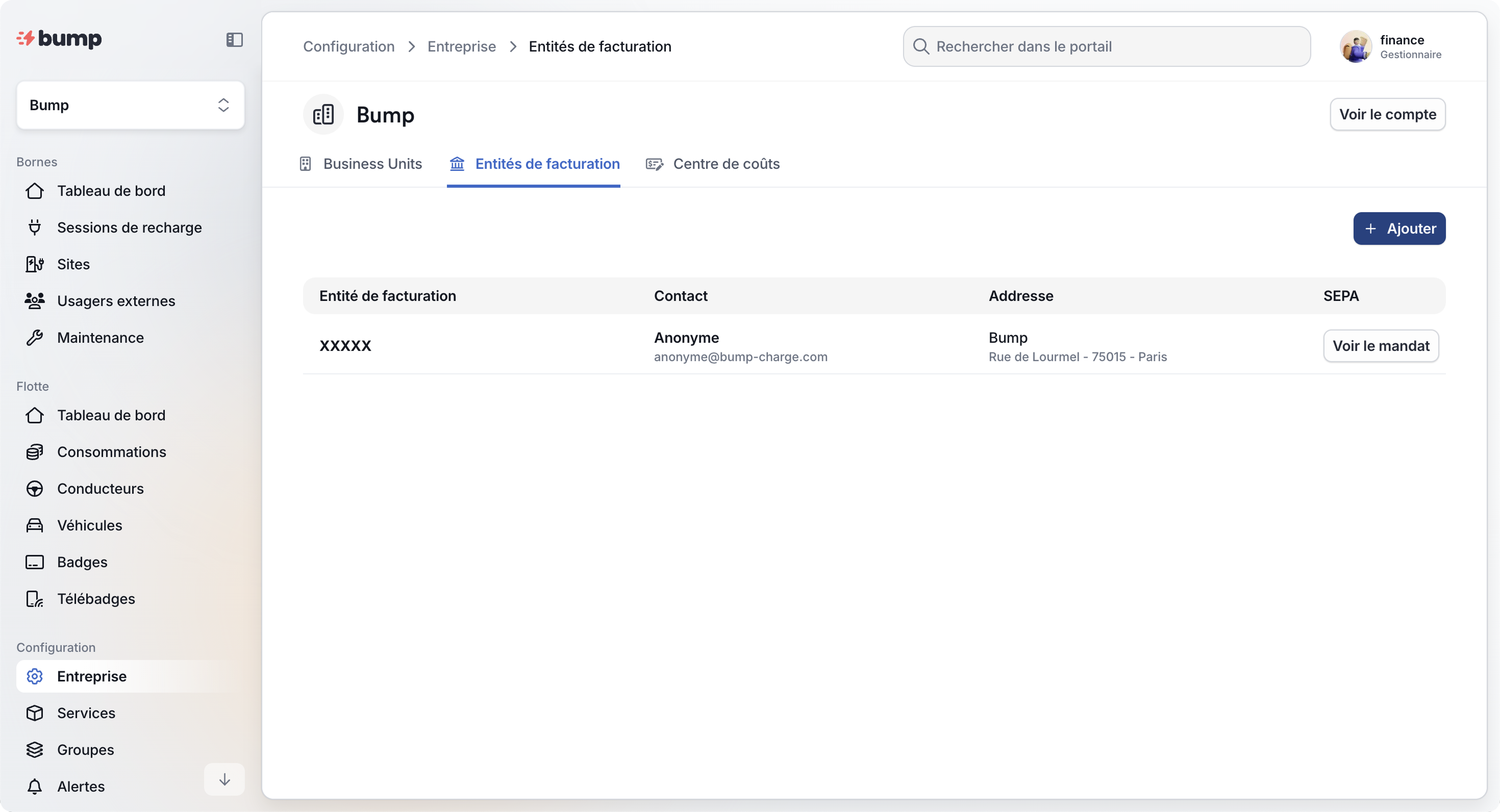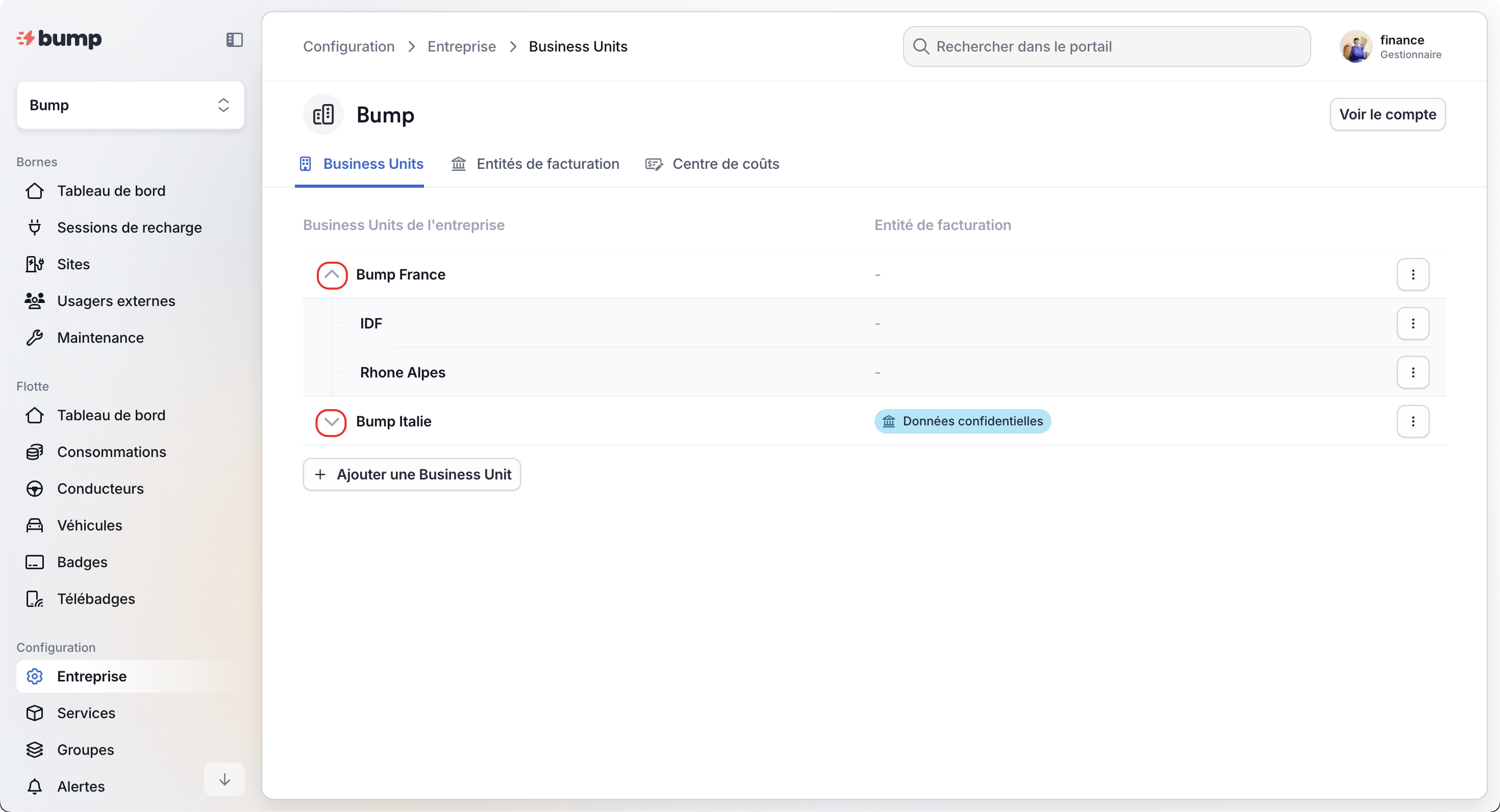 Si vous souhaitez que Bump émette des factures pour plusieurs entités de facturation au sein de votre flotte, vous devrez créer autant d'entités de facturation que nécessaire, puis associer chacune d'elles à une Business Unit (BU) distincte. Chaque entité de facturation devra être reliée à une BU spécifique, à laquelle un conducteur ou un véhicule sera rattaché. Les consommations des conducteurs ou véhicules rattachés à une entité de facturation seront regroupées dans un rapport, et une facture sera envoyée au contact de facturation de cette entité.