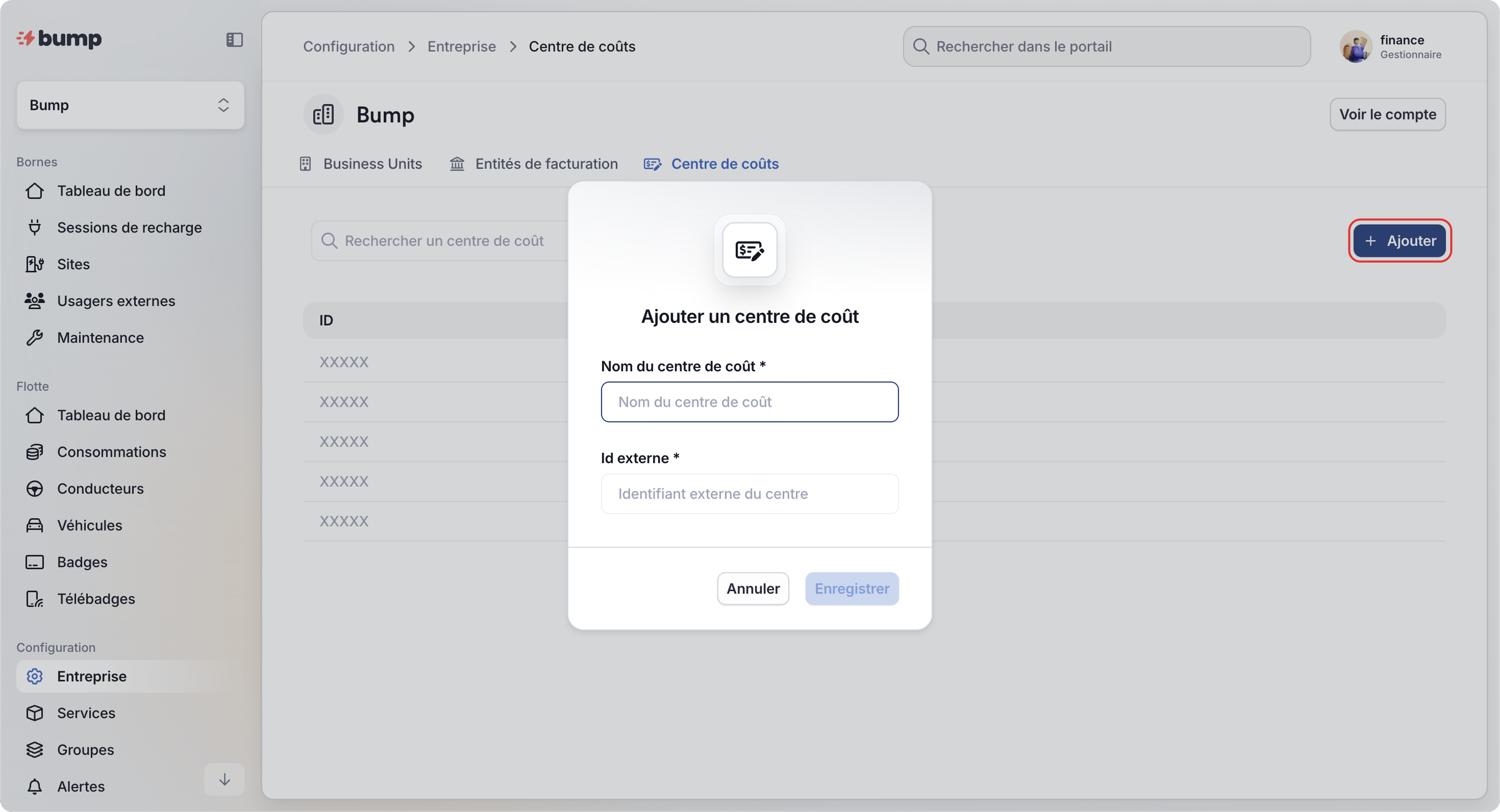 Saisissez vos centres de coûts pour que vous puissiez ensuite suivre les consommations de vos véhicules/conducteurs et consolider votre budget par centre de coûts. Bump propose de saisir un nom (libellé) ainsi qu’un ID. Vous pouvez indiquer la même chose dans les deux champs.