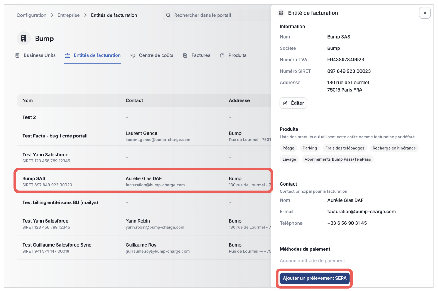 Depuis la liste des entités de facturation, cliquez sur l'entité souhaitée puis sur Ajouter un prélèvement SEPA qui ouvrira une page de procédure en ligne via notre partenaire Stripe.