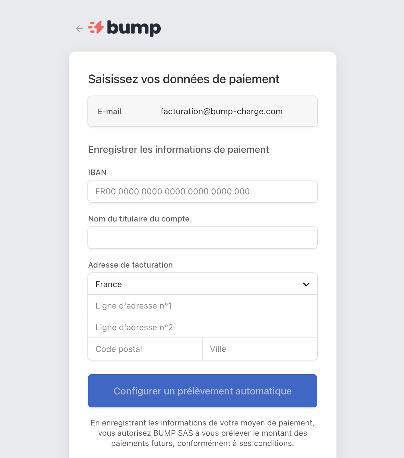 Selon les conditions de paiement convenues au contrat avec Bump, un règlement par mandat SEPA peut être obligatoire.