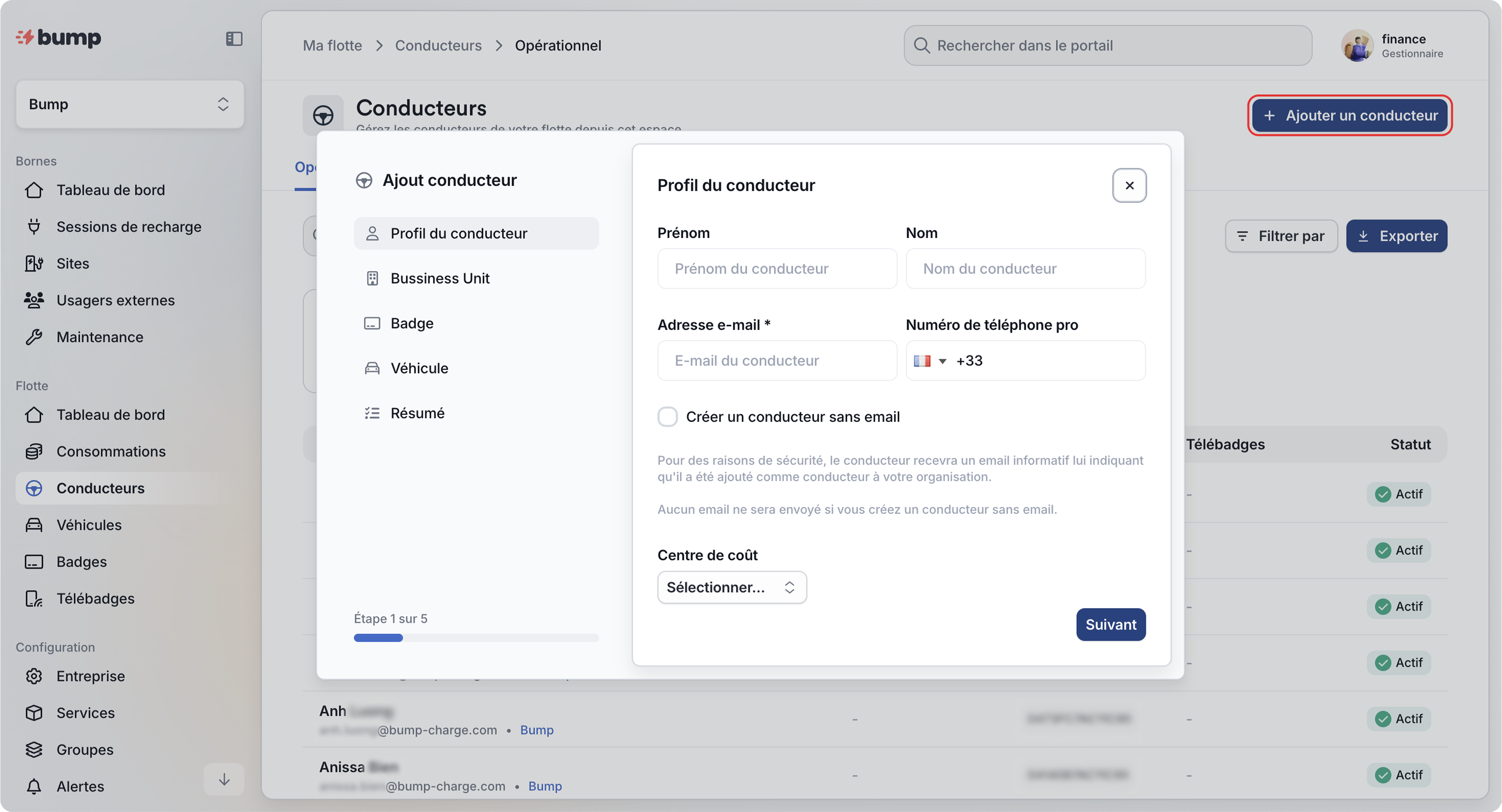 La gestion des conducteurs est essentielle pour un suivi précis de l’activité de votre flotte. Le portail Bump vous permet de gérer et suivre les consommations des véhicules de votre flotte par le biais des comptes utilisateurs ou du/des badges qui leur sont attribués.