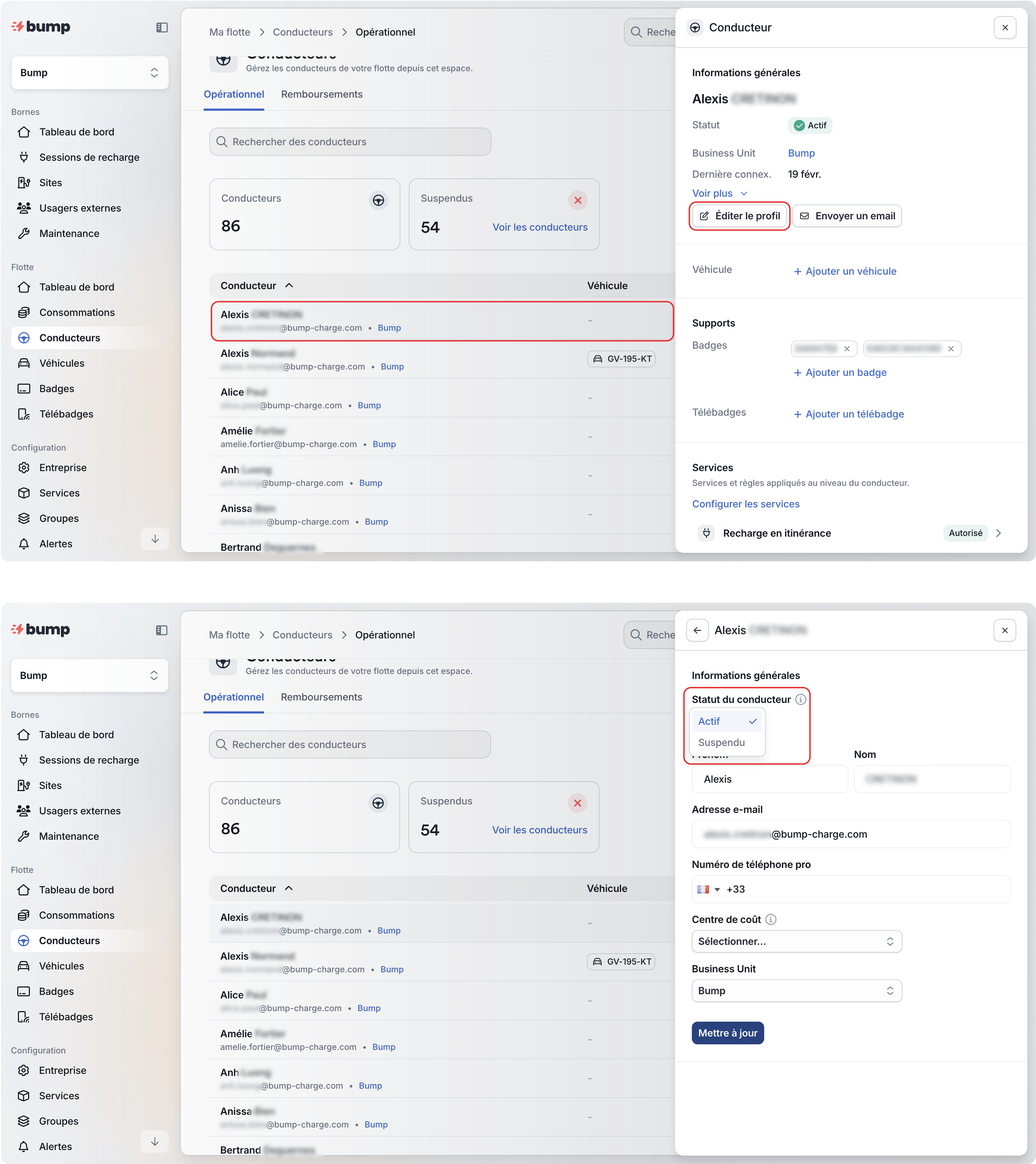 Le portail BtoB vous permet de suspendre un conducteur. Un utilisateur suspendu ne peut plus utiliser son compte Bump depuis l’application, ni le ou les badges qui lui sont rattachés.