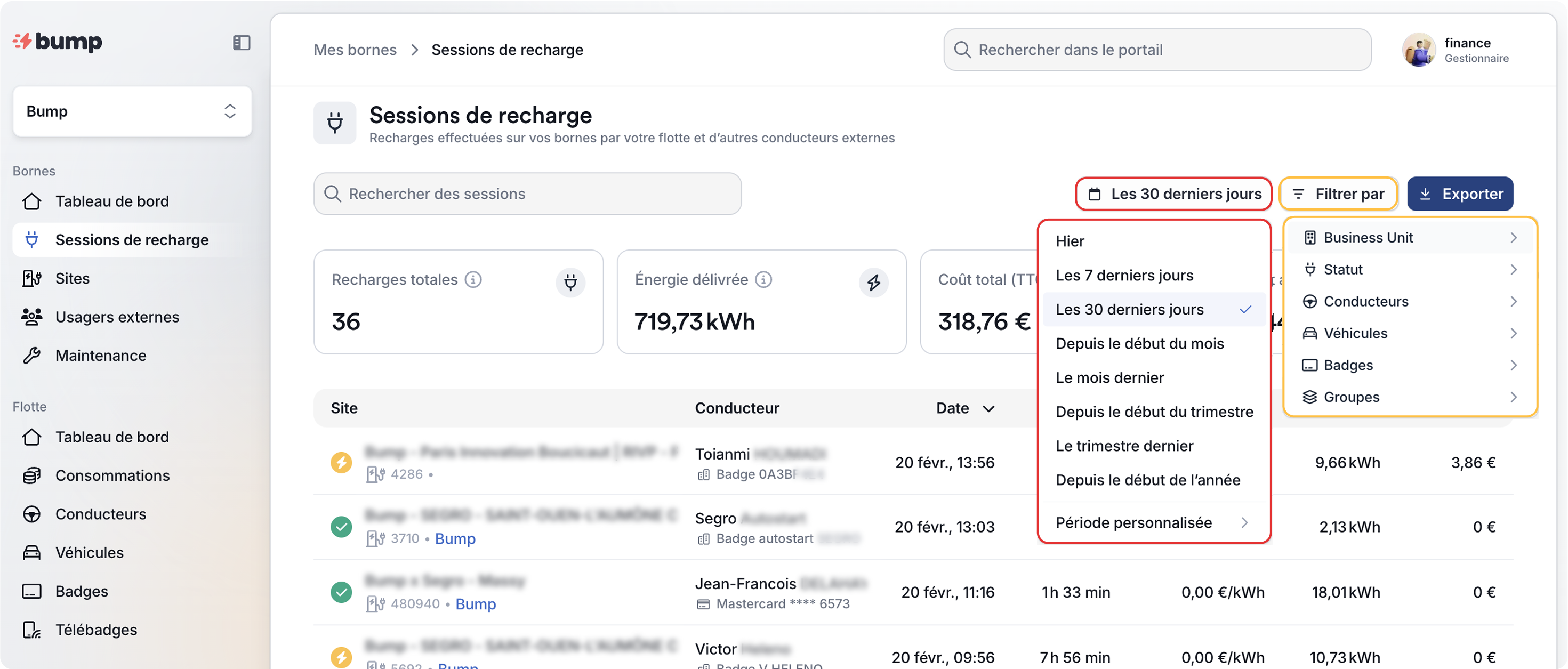Le portail Bump vous présente le détail des sessions réalisées ainsi qu’un récapitulatif des consommations :