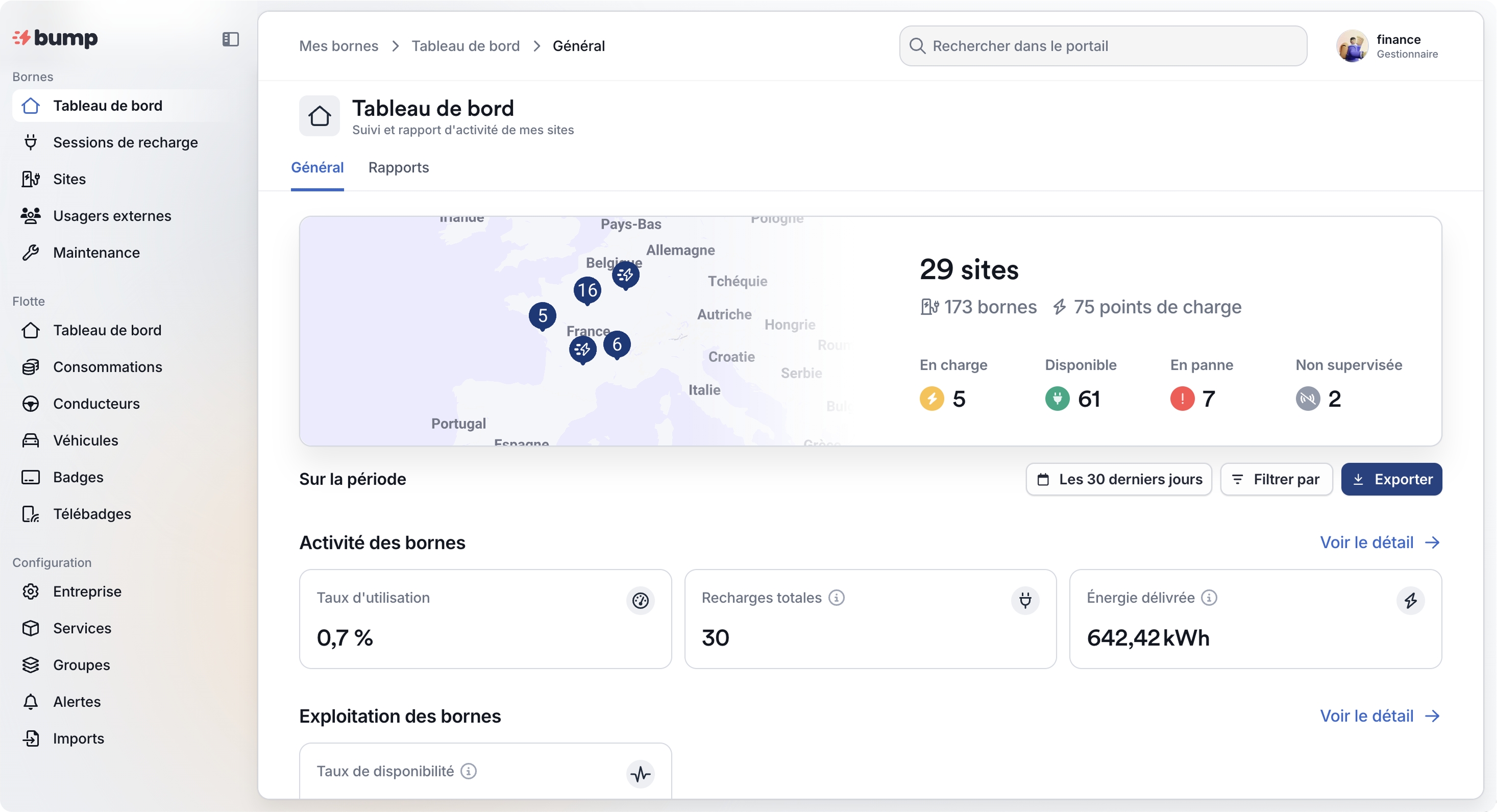 Exemple ci-dessous : le client dispose de 173 bornes réparties sur 29 sites.