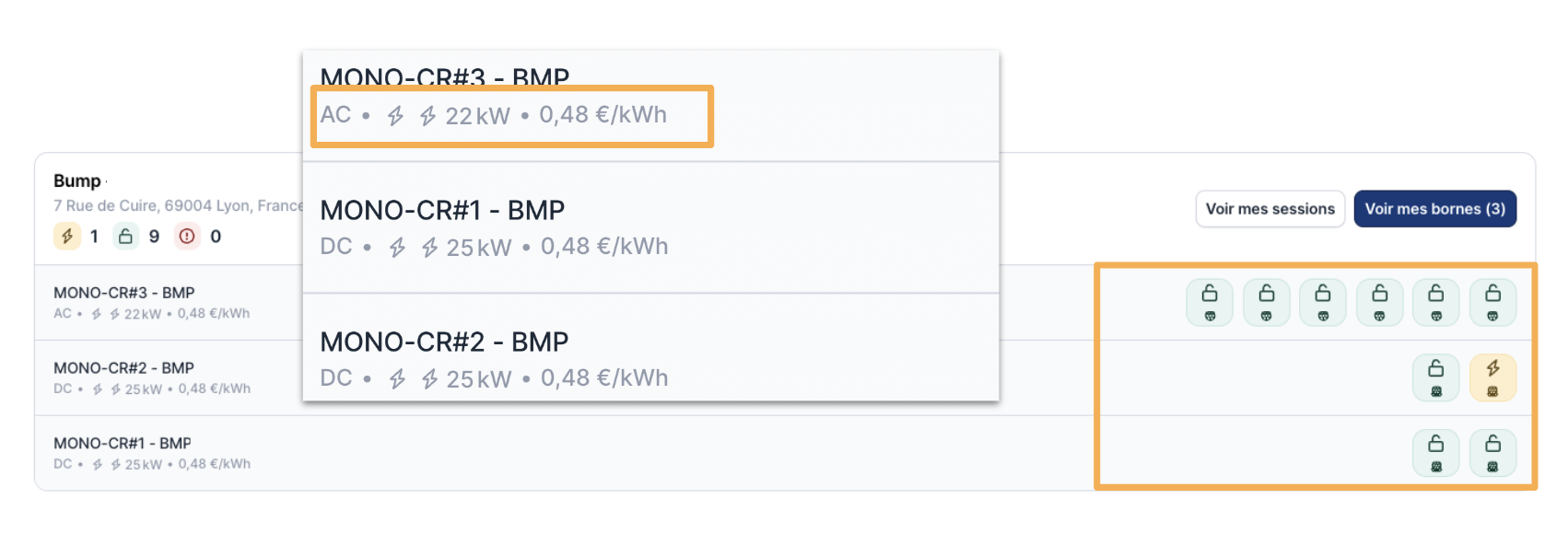 Jetez un coup d’oeil aux différentes bornes disponibles et consultez leur état en temps réel. Que vos bornes soient en cours de recharge, disponible ou indisponible vous pourrez facilement l’identifier.
