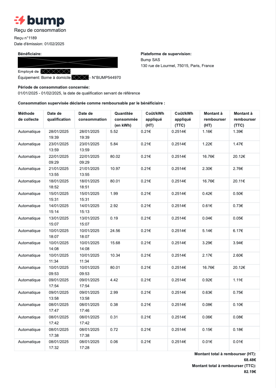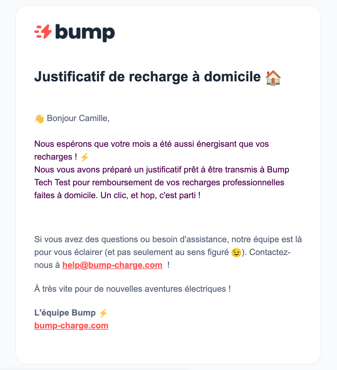 Au début de chaque mois, Bump envoie aux collaborateurs équipés d’un dispositif de recharge à domicile (borne ou câble) un justificatif récapitulant les consommations du mois précédent éligibles au remboursement.