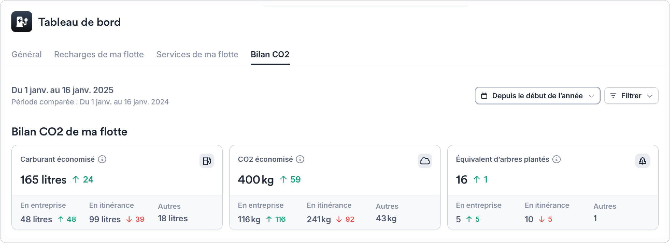 Depuis le portail Bump, rendez-vous dans l'onglet Tableau de bord > Rapports. Nous calculons le bilan CO2 de votre flotte sur la base des consommations effectuées par vos collaborateurs :