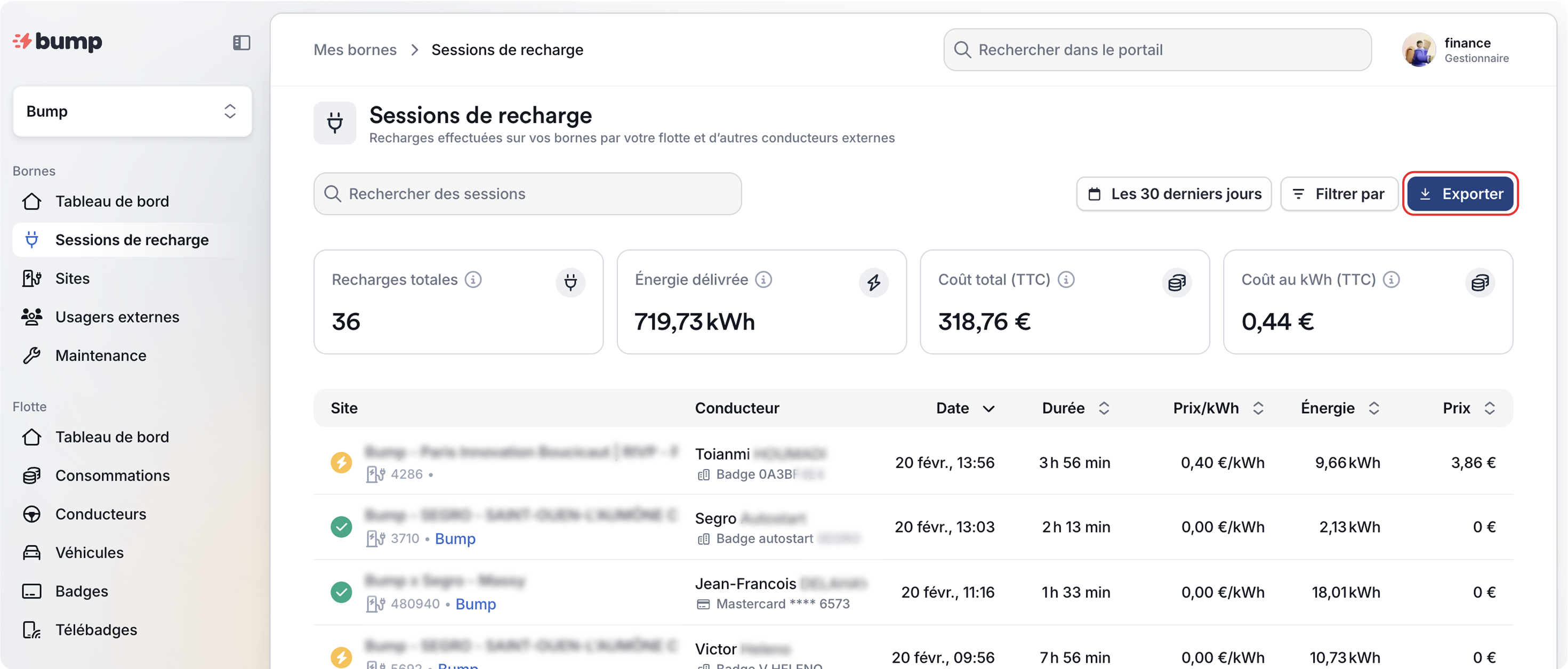 Rendez-vous sur n’importe quelle page (Tableau de bord, sessions de recharge, bornes) ou ajoutez n'importe quel filtre (période, conducteurs,..) et cliquez sur “exporter”.