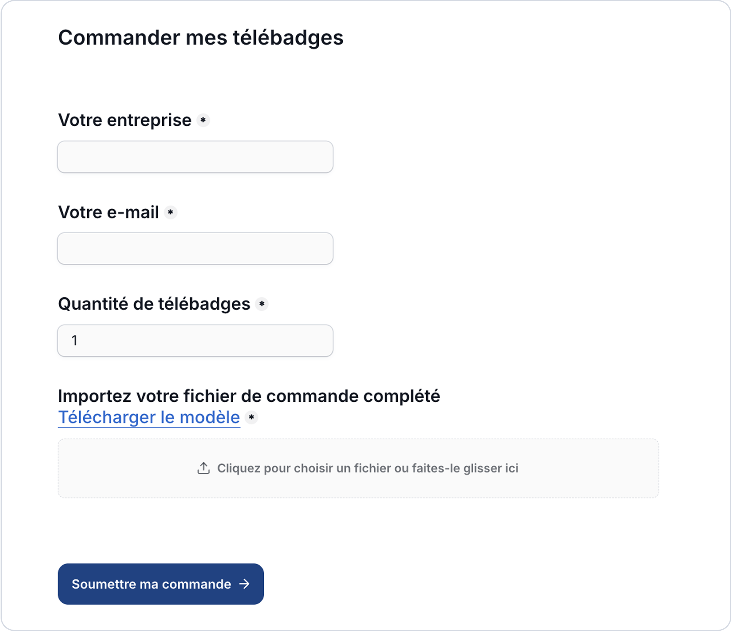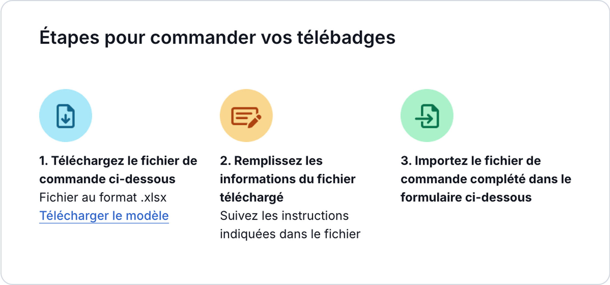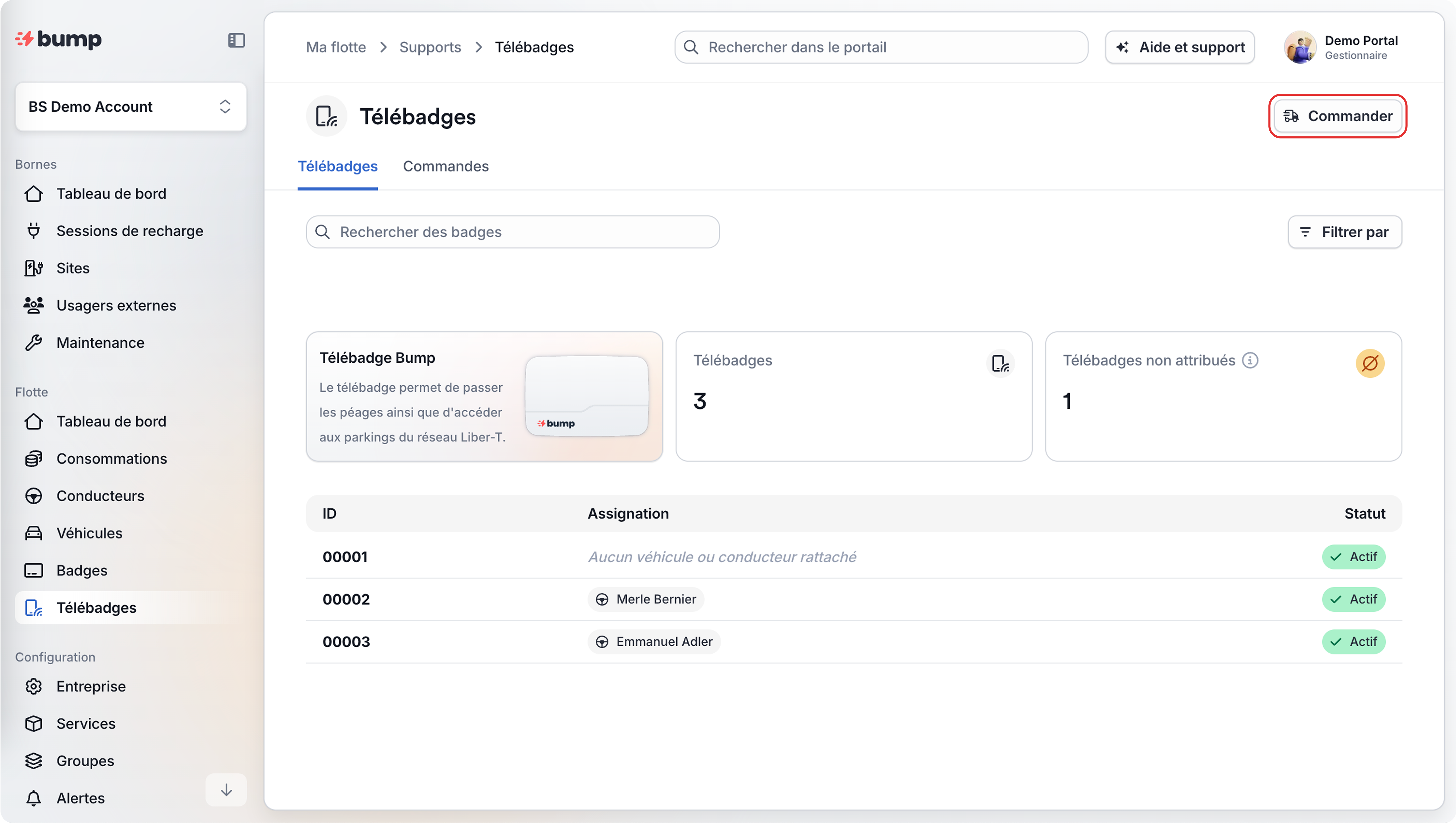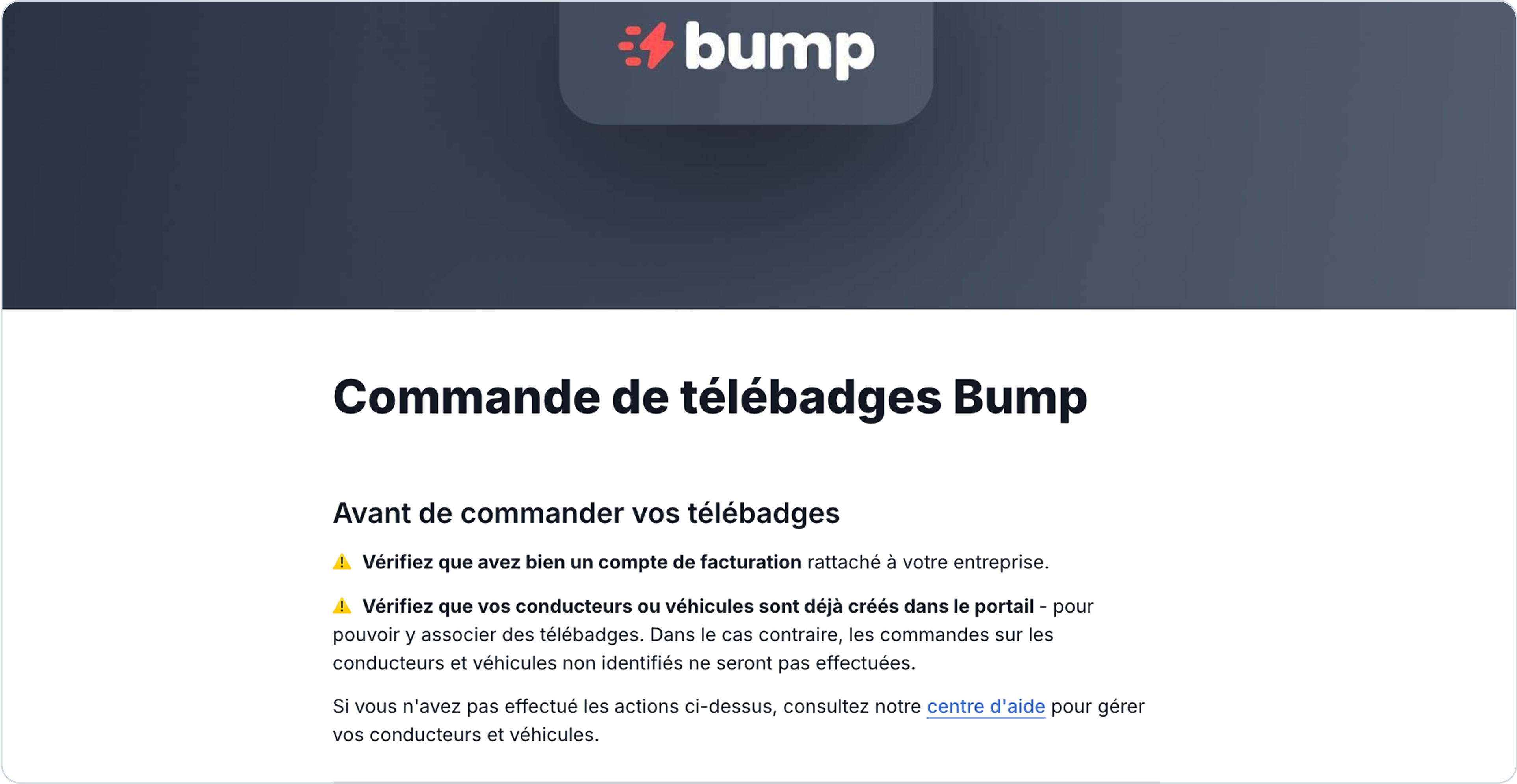Les télébadges se commandent directement depuis le portail Bump. Dès leur réception, les télébadges seront activés automatiquement. Voici les étapes pour commander :