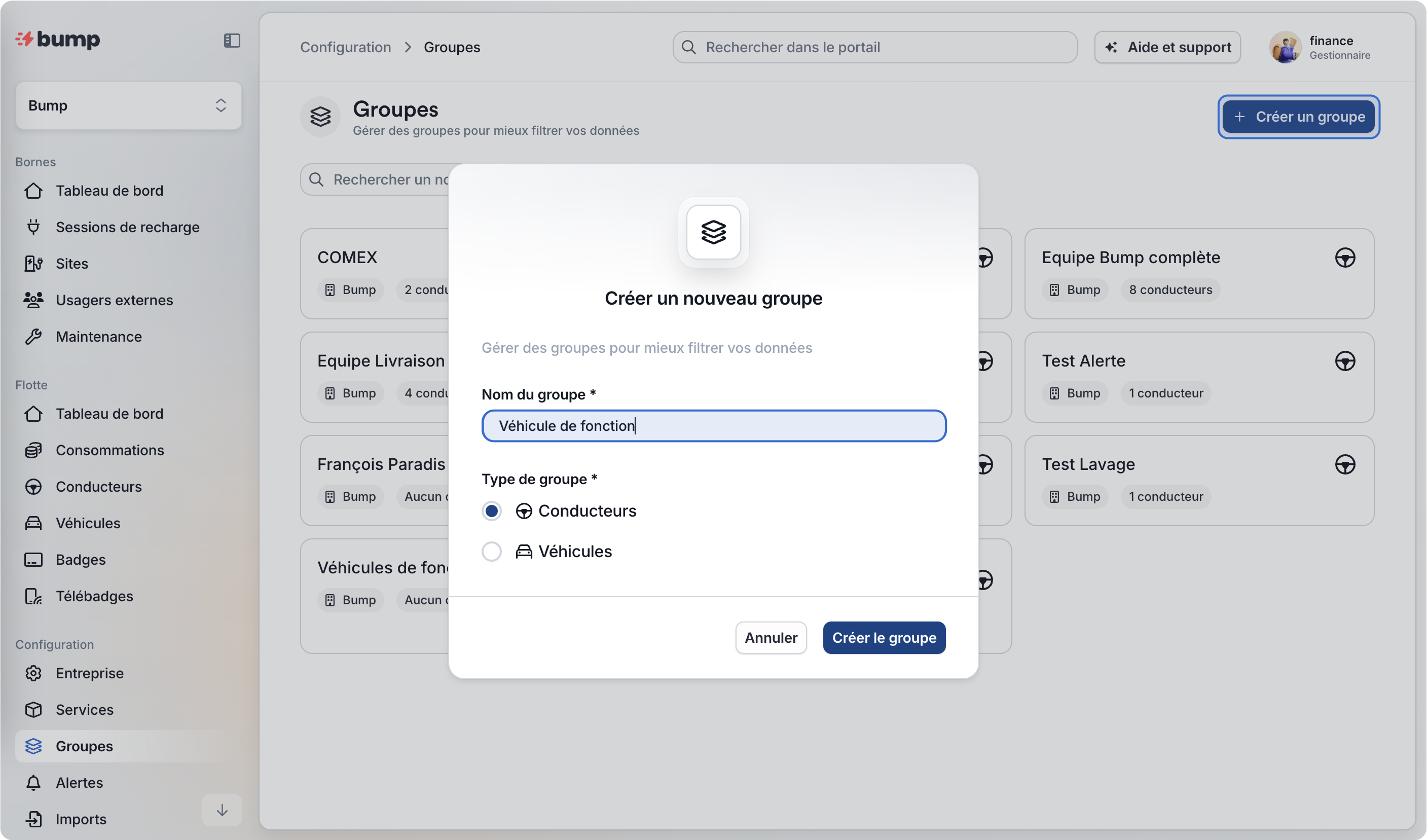 Vous souhaitez prendre en charge la recharge des véhicules de fonction à 100 % et limiter celle des véhicules de service aux jours ouvrés (lundi à vendredi). Pour cela, vous devez créer deux groupes distincts. Voici la démarche à suivre :