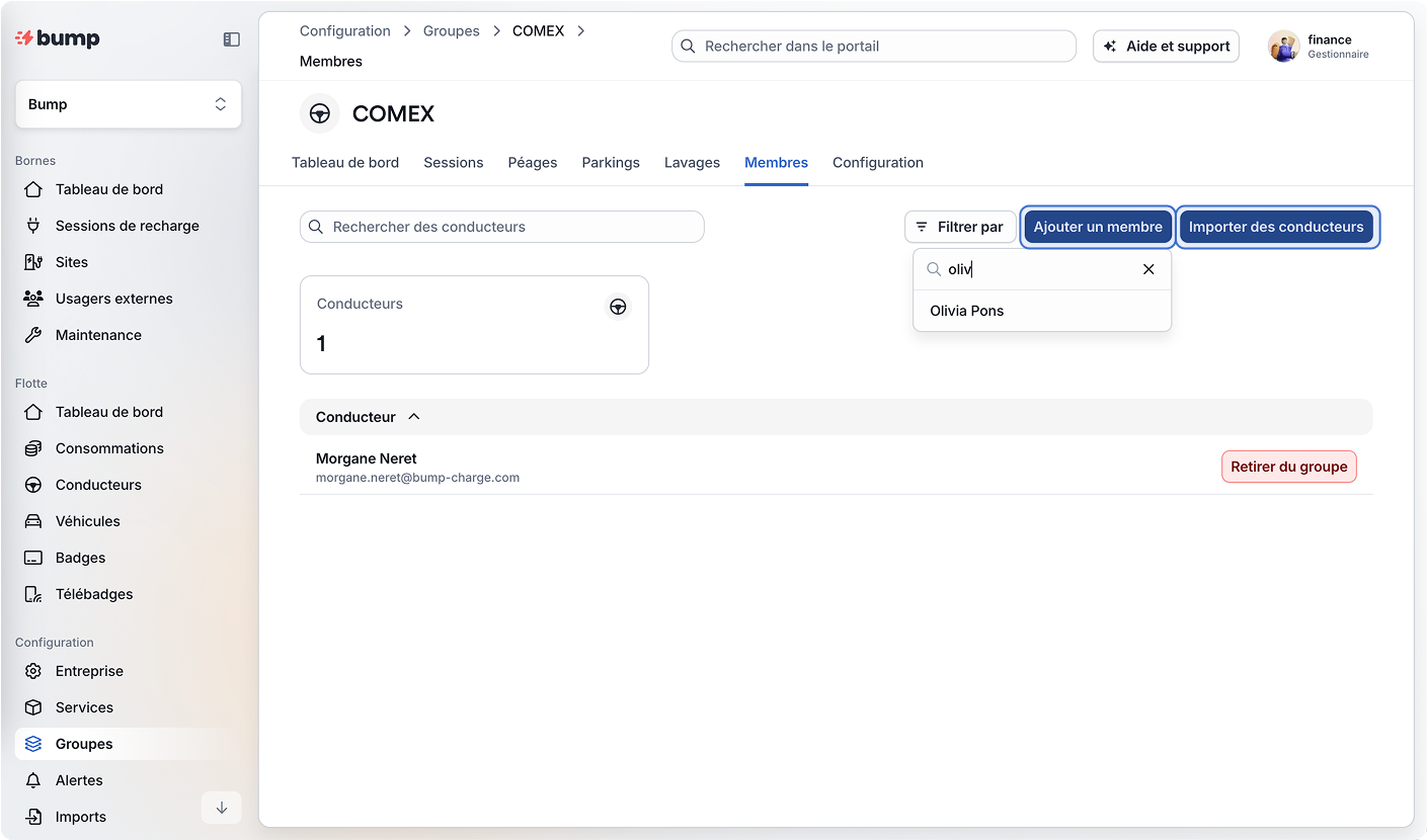 - Par véhicule si l’usage est centré sur les véhicules.Ajoutez les membres concernés en cliquant sur "Gérer" > "Ajouter un membre". Pour un ajout en masse, appuyez sur le bouton "Importer des conducteurs".