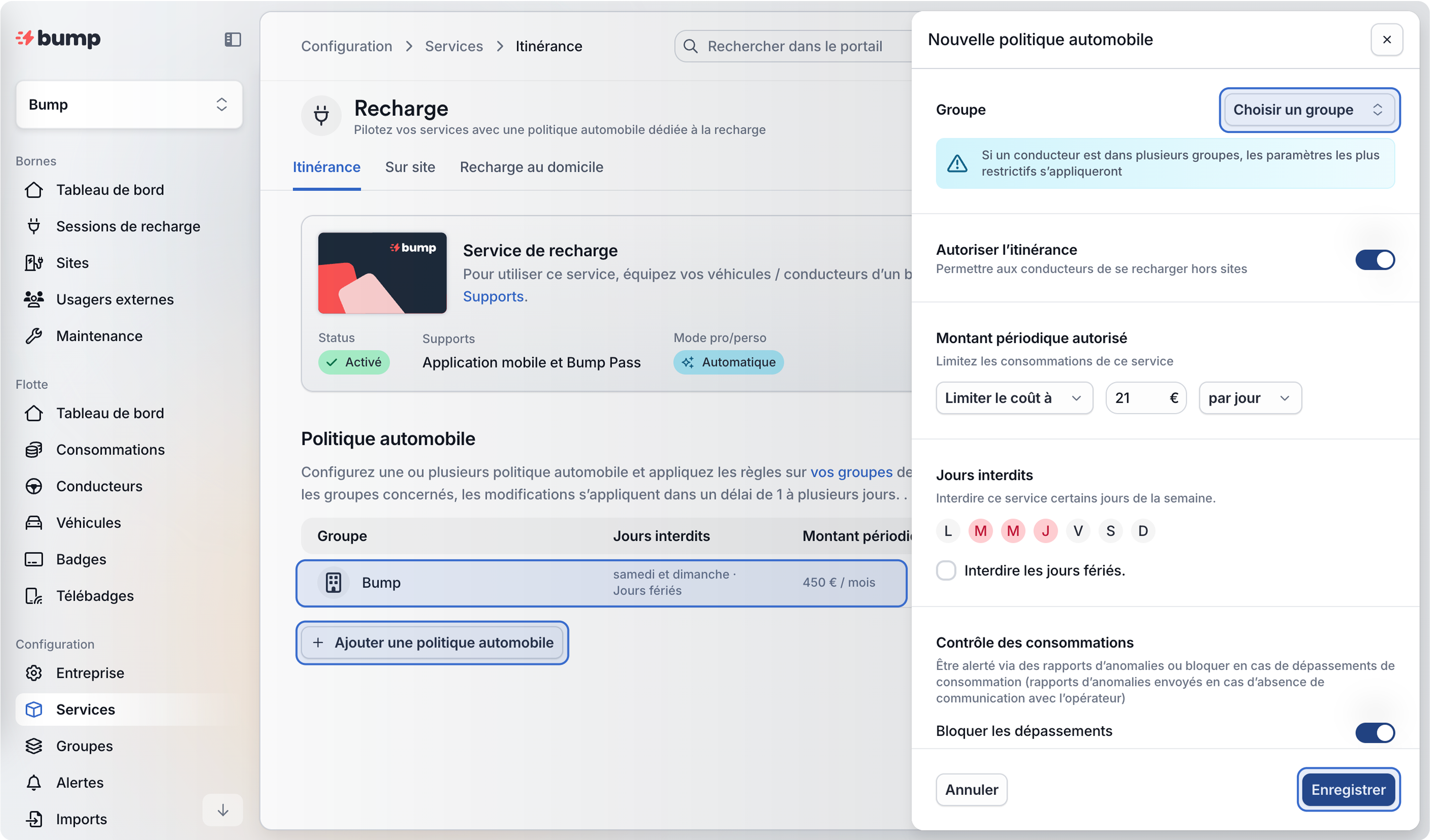 Jours interdits : Permet d'informer l'usager que l’utilisation de la carte Bump aux frais de l’entreprise est déconseillée certains jours (ex. : week-ends). Le salarié peut tout de même forcer le mode pro ou utiliser la carte avec sa CB personnelle via l'app mobile.