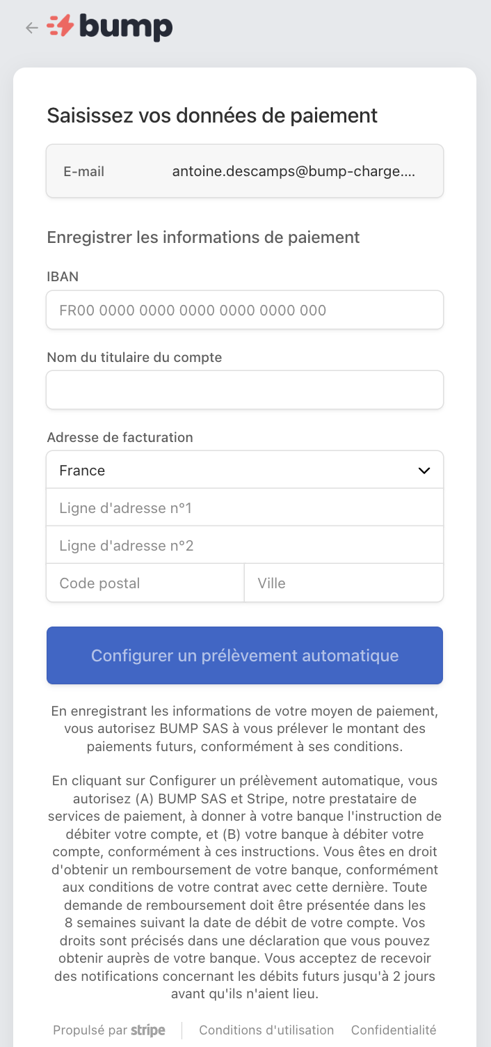 Un onglet Stripe s'ouvre, vous pouvez alors remplir vos informations bancaires et autoriser le prélèvement automatique.