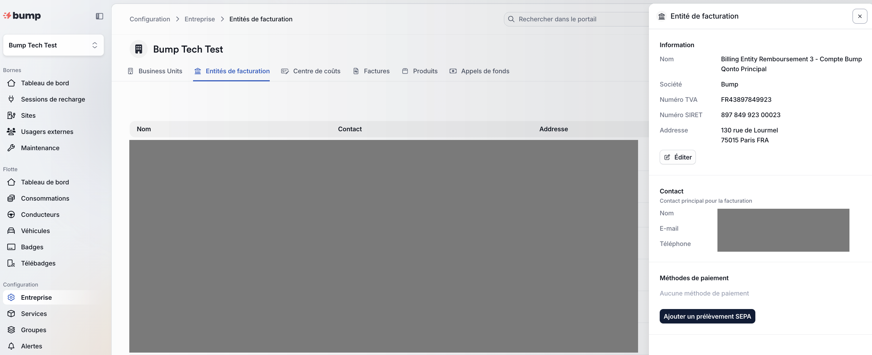 Cliquez sur une entité de facturation et cliquer sur le bouton bleu en bas à droite "Ajouter un prélèvement SEPA".