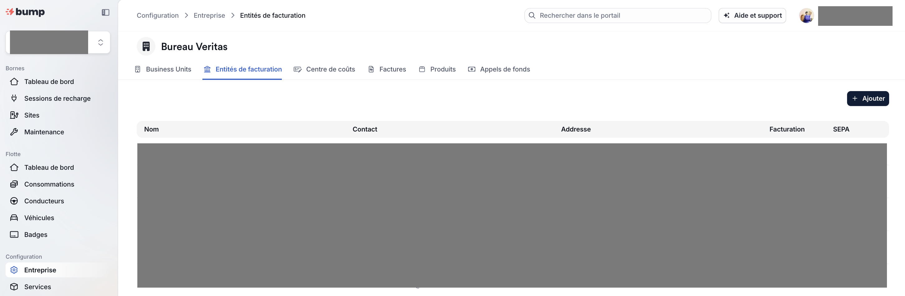 Allez dans "Entreprises > Entité de facturation" et cliquer sur le bouton "Ajouter" en bleu à droite.