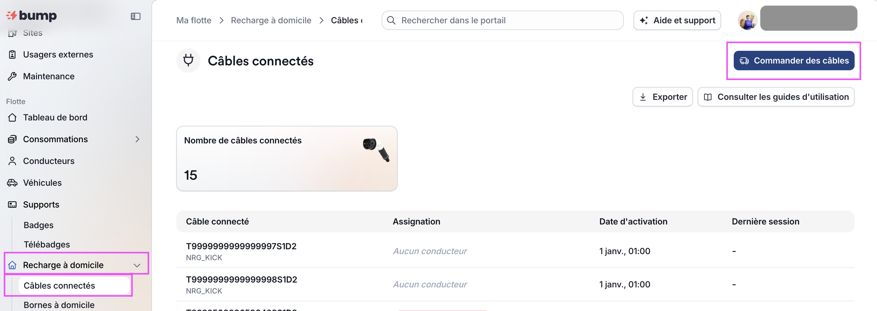 Portail Bump → Recharge à Domicile → Câbles connectés → Bouton “Commander des câbles”