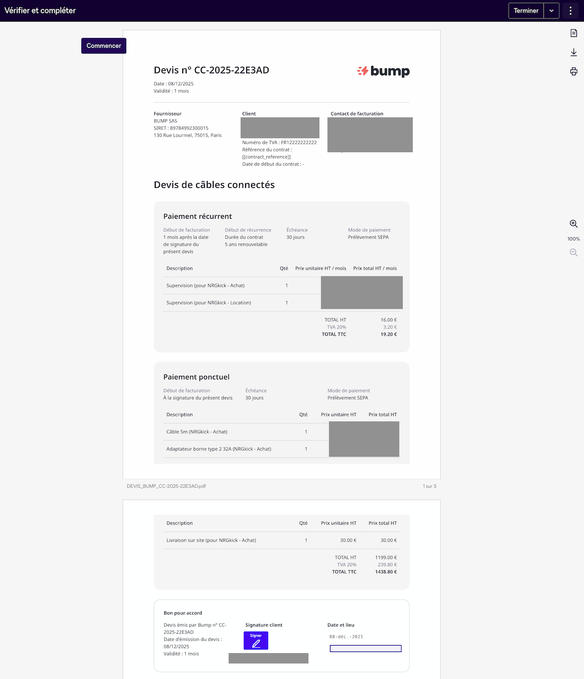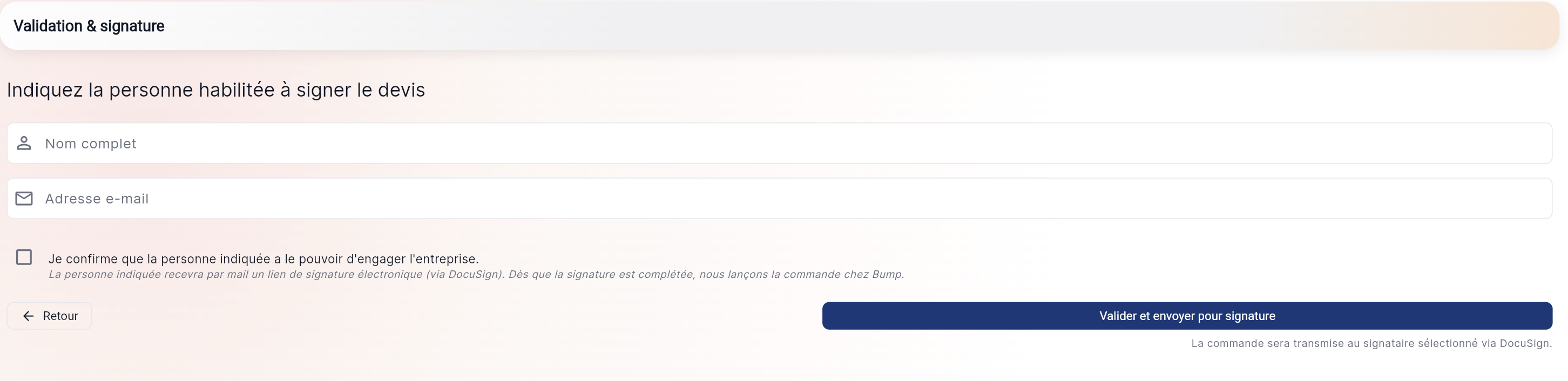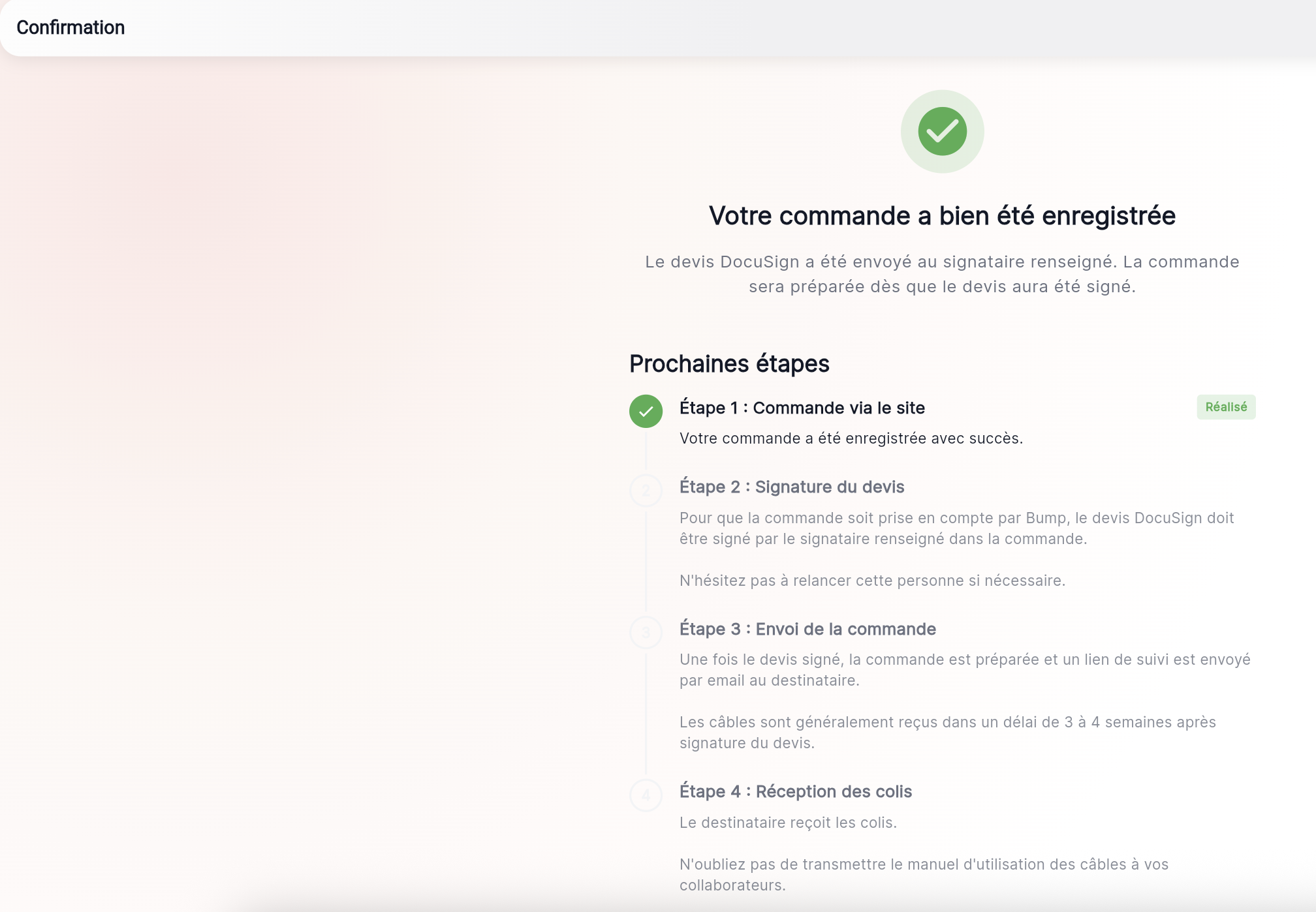 Dès la confirmation du récapitulatif de la commande, le devis est envoyé pour signature.